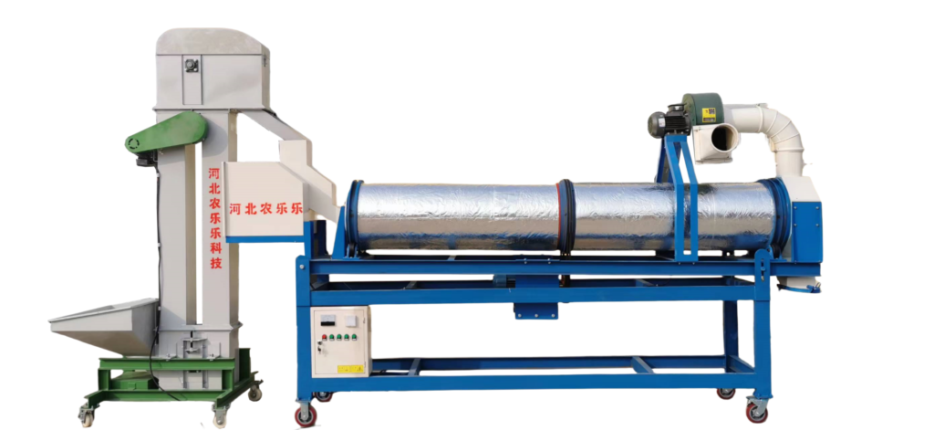 The dryer adopts the downstream drying process, and uses hot air as the hot medium to dry the seeds. In the parallel flow seed dryer, the hot air and the seed flow direction are the same, and the high-temperature hot air first meets the wettest and coldest seeds, so its drying characteristics are different from the cross flow dryer; The parallel flow dryer can save 30% energy than the traditional cross flow dryer. The machine is mainly composed of air inlet ventilation regulation and rolling cylinder tilt angle regulation. After the grain enters the roller from top to bottom, the roller drives the seed to turn over repeatedly. The hot air enters from the air inlet ventilation and passes through the grain layer backwards. When the hot air passes through the grain layer, it transfers heat and moisture with the seed; The hot air transfers the heat to the seed to raise its temperature. When the seed is heated, the water evaporates into the air and becomes exhaust gas. The dried seeds flow backward to the grain outlet for discharge.